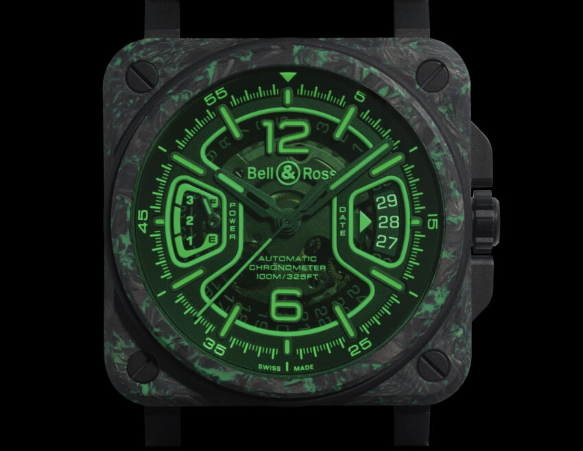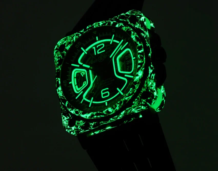 Esta proeza lumínica comienza con una caja de 41 mm que ostenta una novedosa construcción en capas de diferentes materiales de última generación y diversos componentes. Por ejemplo, la placa frontal y trasera están hechas de LUM- CAMO, un material integrado por fibra de carbono y una mezcla de resina con incrustaciones luminiscentes. La caja intermedia está fabricada de titanio recubierto de PVD negro. Todo está fijo con cuatro tornillos alojados en unos cilindros protectores que, para el BR-X3 Night Vision, se fabricaron de caucho verde luminiscente que acentúa su visualización nocturna.