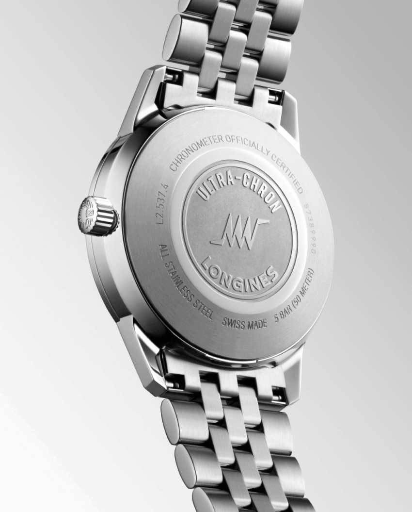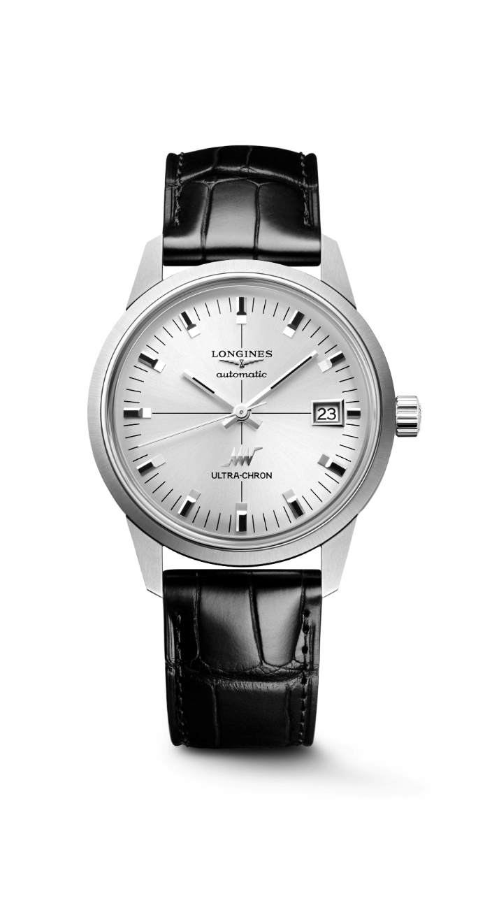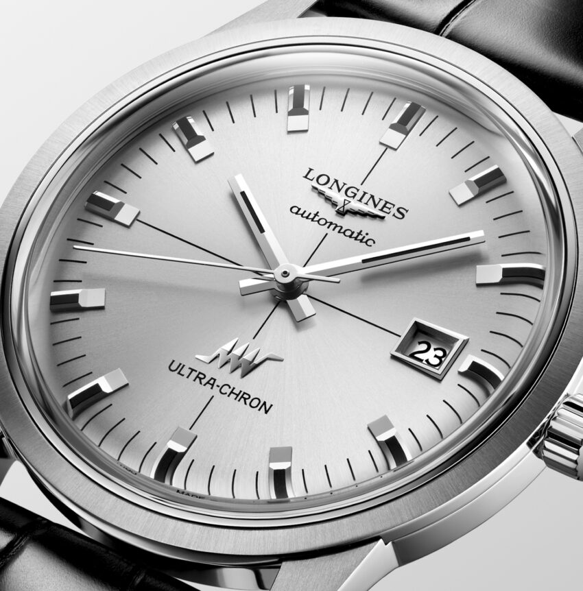 Fiel al diseño original, la carátula abombada en color plata con efecto rayos de sol luce orgullosa los logotipos de Longines y de la alta frecuencia. Sus índices y agujas aplicados con pulido plateado, marcan horas minutos y segundos. El recuadro de fecha con forma de trapecio se muestra a las 3 h, y utiliza la misma fuente que en el modelo originario. Todos los detalles de la carátula refuerzan la impronta atemporal del Ultra-Chron Classic.